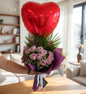 10 adet ithal lila gülün asil duruşu, yanında yer alan kalp balonun tatlı ve neşeli havasıyla birleşerek etkileyici bir hediye haline gelir. Lila güller hayranlık ve zarif sevgiyi temsil ederken, kalp balon bu ifadeyi sevimli bir dokunuşla tamamlar.
