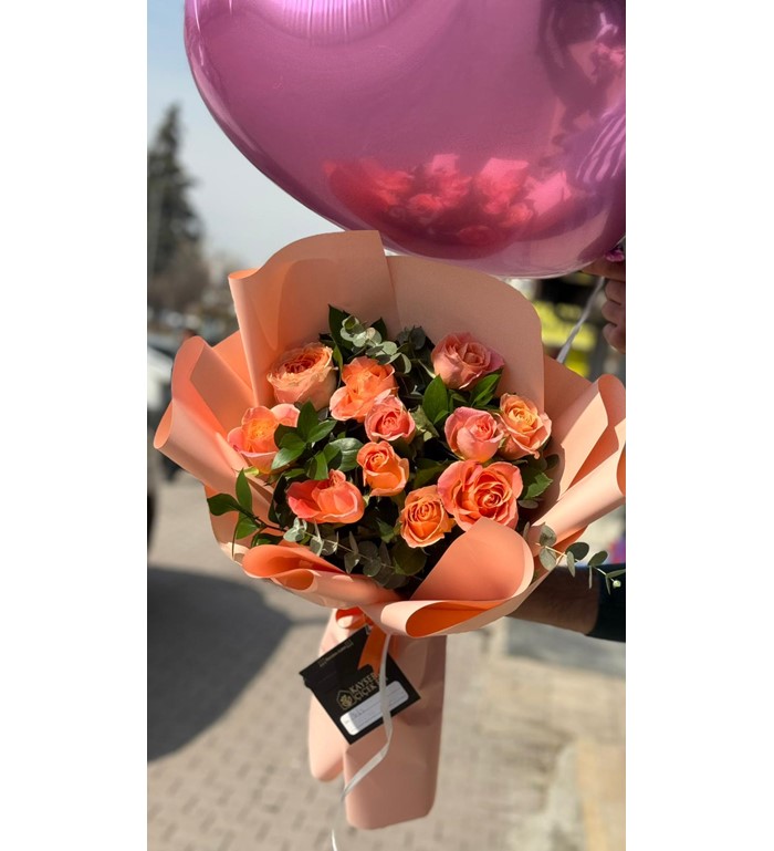 Zarif somon tonlarının sıcaklığı ve pembe kalp balonun romantik dokunuşu bir arada… 10 adet ithal somon gül ile hazırlanan bu özel tasarım, hem şık hem de duygusal bir sürpriz sunar. Doğum günü, yıldönümü ve romantik anlar için etkileyici bir tercih olur. Taze ve özenle seçilmiş güllerle hazırlanır.