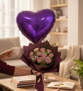 Lila tonlarının büyüleyici uyumu ve kalpli balonun sıcak enerjisiyle hazırlanan bu özel tasarım, duygularınızı en romantik haliyle anlatır.