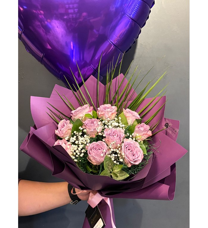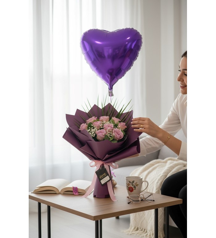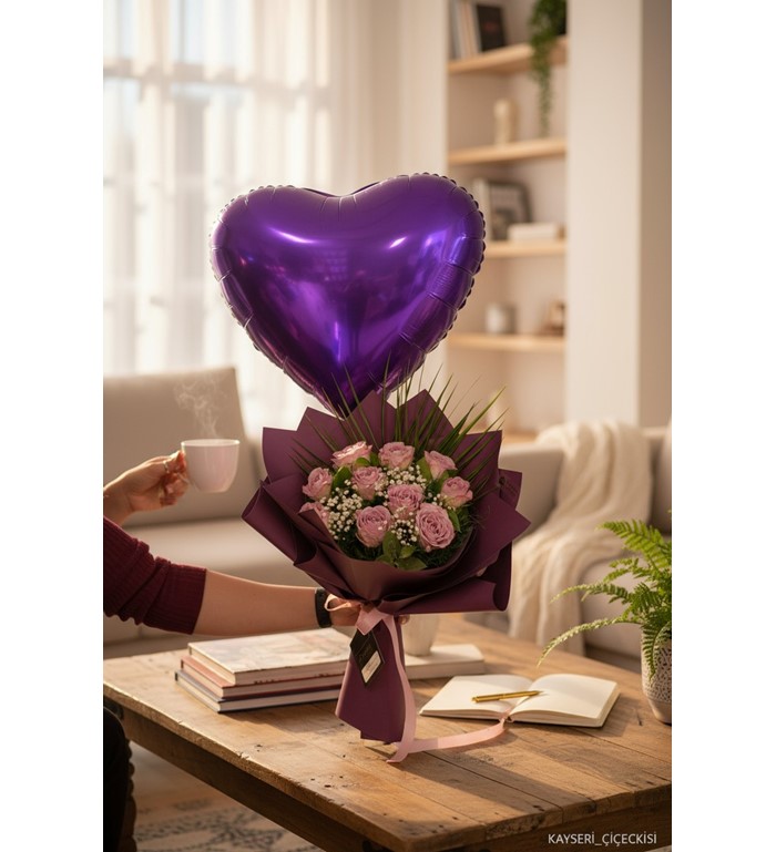 10 adet taptaze lila gülden hazırlanan bu özel buket, yanında yer alan kalpli balon ile sevgilinize unutulmaz bir sürpriz yapmanızı sağlar. Lila güller, zarafetin ve içten sevginin simgesidir. Doğum günü, özür dileme, yıldönümü ya da “seni seviyorum” demek için mükemmel bir tercihtir.