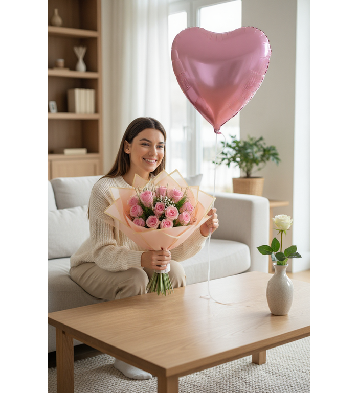 Romantik ve zarif bir sürpriz hazırlamak isteyenler için tasarlanan 10 Pembe Gül Buketi ve Kalp Balon, duyguları en naif haliyle ifade etmenin şık bir yoludur. Özenle seçilmiş taze pembe güller, zarif buket formunda hazırlanır ve kalp şeklindeki balon ile birleşerek unutulmaz bir hediye sunar.
