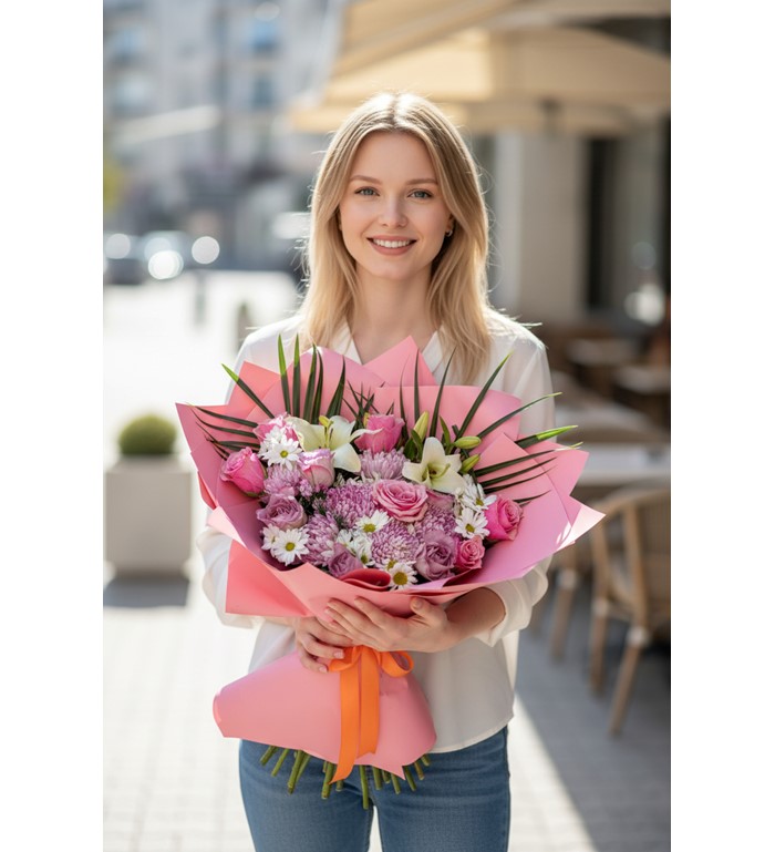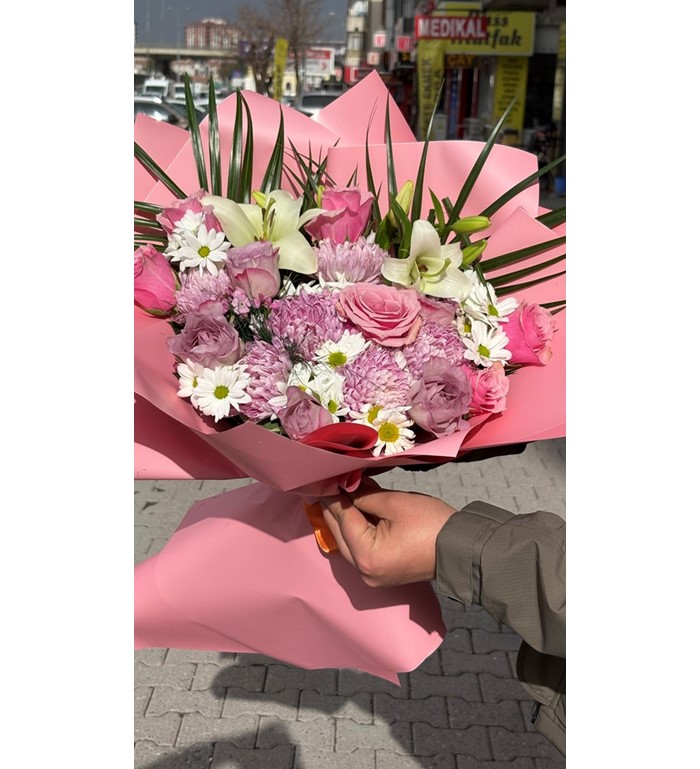 Canlı renklerin uyumu ve zarif çiçeklerin şıklığı bir arada. 10 adet renkli gül, 2 dal lilyum ve 6 adet anastasya ile hazırlanan bu özel buket; sevdiklerinize mutluluk, enerji ve zarafet dolu bir sürpriz sunar. Özenle hazırlanan tasarımıyla her özel güne anlam katar.