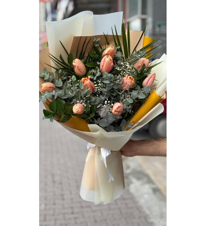 10 dal somon lale, zarif ve kompakt yapısıyla her ortama estetik bir dokunuş katar. Somon renginin sıcaklığı ve modern paketleme detayları, klasik çiçek tasarımlarından sıkılanlar için fark yaratan bir alternatif sunar.