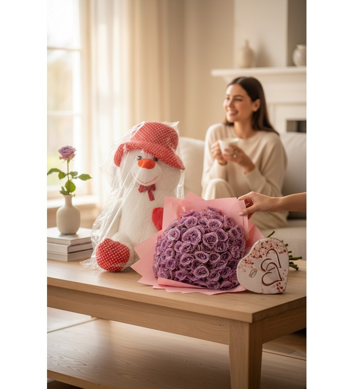 Romantik sürprizlerin en özel hali olan 101 Lila Gül Ayıcık ve Kalp Çikolata Paketi, sevdiğiniz kişiye unutulmaz bir an yaşatmak için özenle hazırlanmıştır. Gösterişli 101 adet lila gül, sevimli peluş ayıcık ve kalp şeklinde çikolata kutusu ile birleşerek şık ve duygusal bir hediye paketine dönüşür.