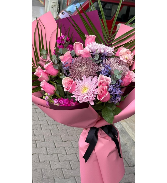 Aşkın ve nezaketin simgesi 12 adet ithal pembe gül, gösterişli ve katmerli yapısıyla büyüleyen 4 adet Anastasya çiçeği ile birleşerek göz alıcı bir aranjmana dönüştü. "Premium" koleksiyonumuzun bu nadide parçası, hem hacimli duruşu hem de soft renk geçişleriyle sevdiklerinize kendilerini çok özel hissettirecek. Modern paketleme detayları, çiçeklerin doğal zarafetini ön plana çıkarıyor.