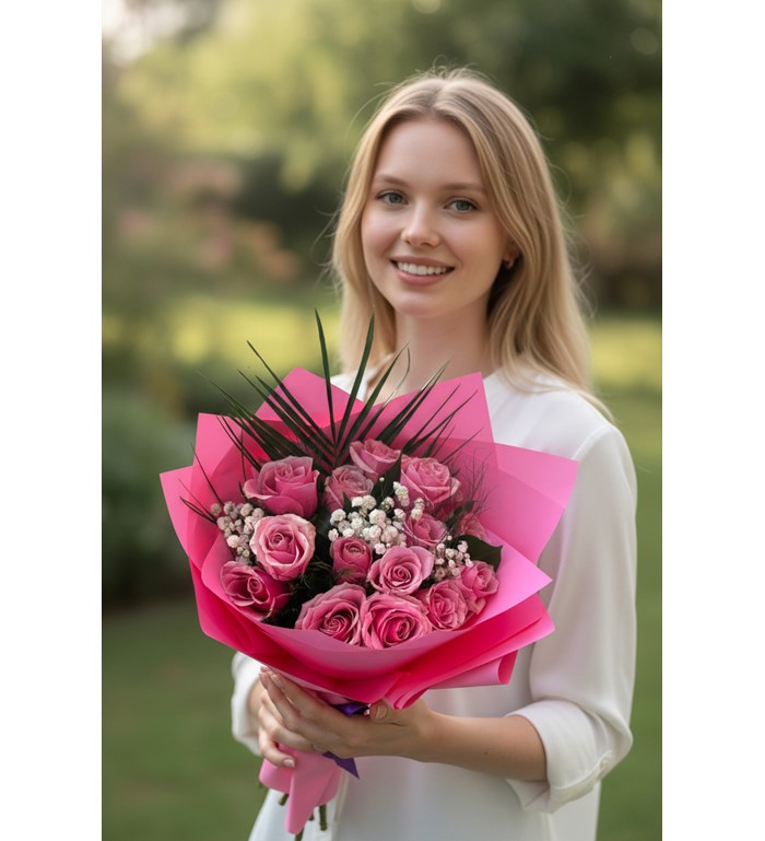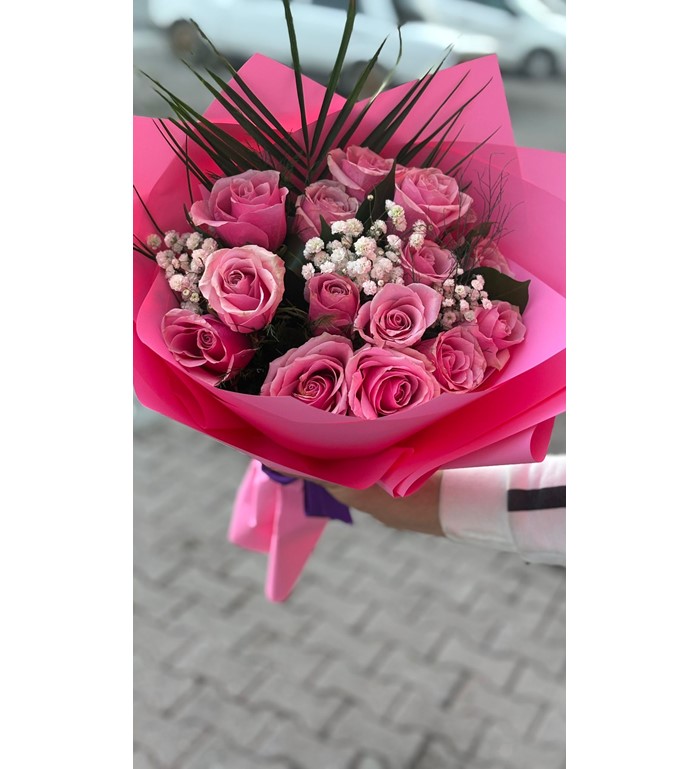 15 adet ithal pembe gül, zarif ve romantik bir buket tasarımıyla özenle hazırlanır. Pembe güllerin yumuşak ve sıcak tonları, şık ambalaj detaylarıyla tamamlanarak özel anlara anlam ve estetik katar.