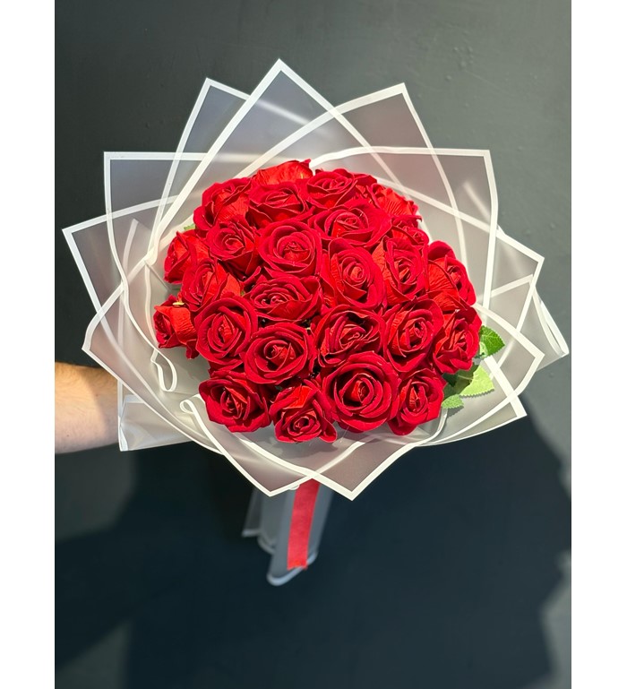 Aşkın en zamansız hali... Solmayan güzelliğiyle özel anlara kalıcı bir dokunuş katmak isteyenler için 25 adet kırmızı yapay gül ile hazırlanmış şık buketimiz, romantik ve zarif bir hediye alternatifi sunuyor. Gerçeğe en yakın dokuya sahip yapay güller, her mevsim taptaze görünümüyle göz kamaştırıyor.