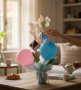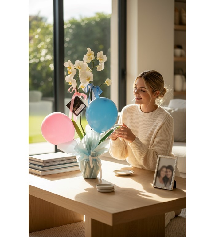 Doğum, bebek ziyaretleri veya hastane kutlamalarında öne çıkan bu aranjman, mutluluğu ve saflığı simgeler. Özel dekoratif detaylarıyla hem estetik hem anlam dolu bir hediye alternatifi oluşturur.