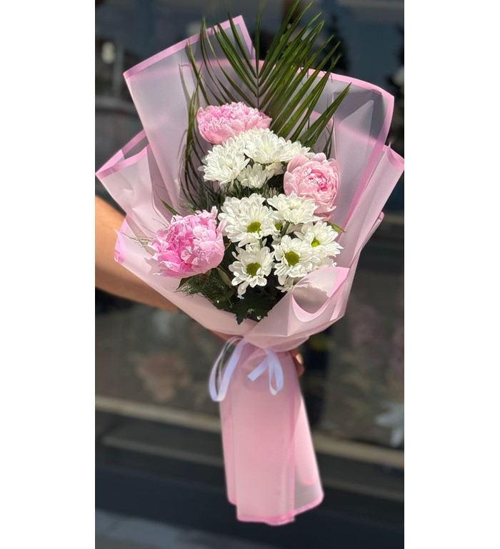 Gösterişli pembe şakayıklar ile masumiyetin sembolü papatyaların bir araya geldiği bu buket, hem romantik hem de içten bir hediye arayanlar için hazırlandı.