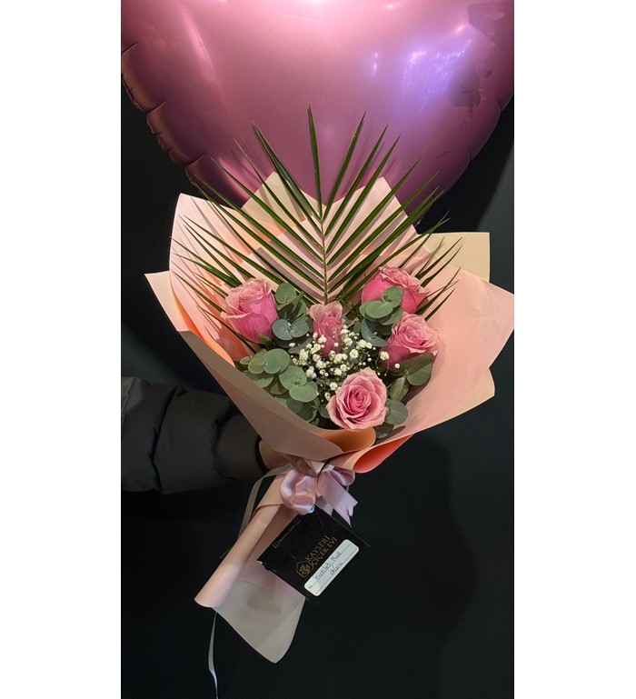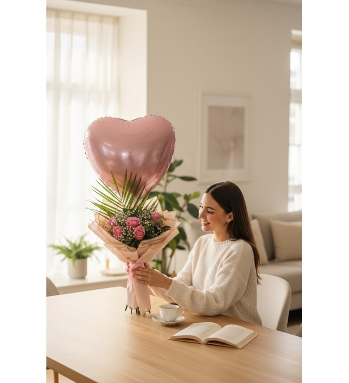 Aşkınızı sade ama etkileyici bir şekilde ifade etmek ister misiniz? 5 adet ithal pembe gülün zarafetiyle hazırlanan bu özel buket, yanında yer alan kalp şeklindeki balonla duygularınızı tatlı bir dille anlatır. Romantik sürprizler, doğum günleri ya da özel günler için mükemmel bir tercihtir. Pembe güller, sevgi, zarafet ve içten duyguların en güzel simgesidir.