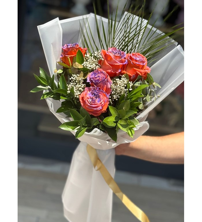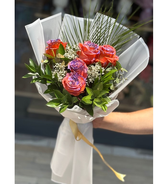 Canlılığın ve zarafetin eşsiz uyumu: Turuncu ve mor güllerin büyüleyici birlikteliğiyle hazırlanan bu özel buket, duygularınızı sıra dışı bir şekilde ifade etmenin en etkileyici yollarından biri. 5 adet ithal gül, modern ve sade ambalajıyla göz alıcı bir bütünlük sunar. Doğum günü, sevgililer günü ya da içten bir sürpriz için ideal bir tercihtir.