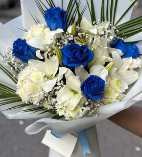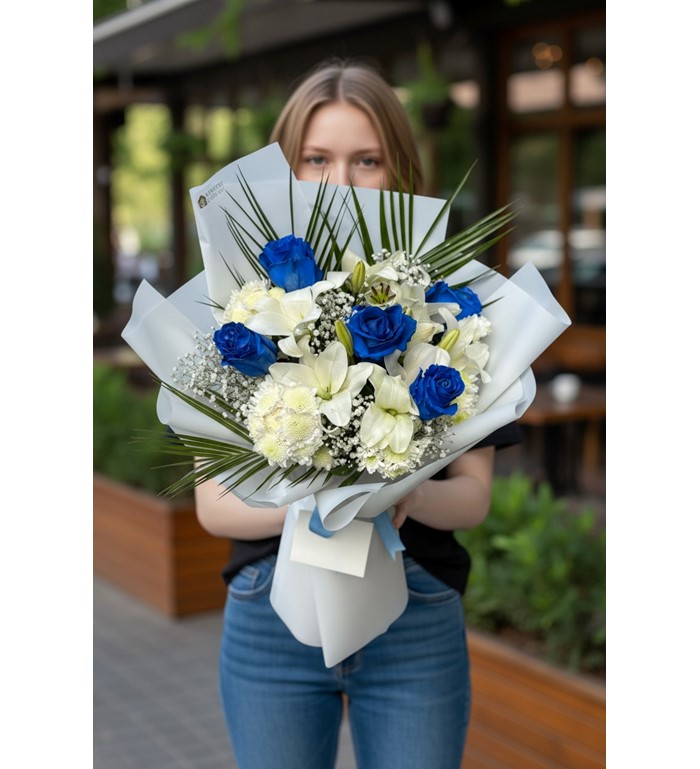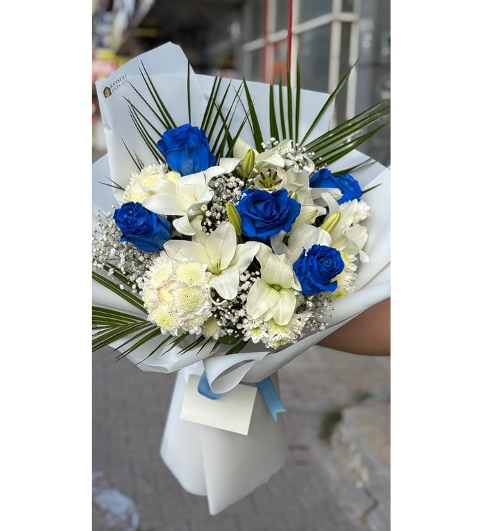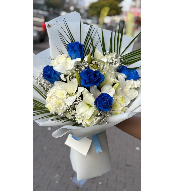 5 mavi gül, beyaz lilyum ve papatyanın zarif uyumundan oluşan bu özel buket, hem modern hem de ferah bir görünüm sunar. Şık tasarımı sayesinde doğum günü, özel gün kutlamaları, tebrik ve sürpriz çiçek gönderimleri için ideal bir seçenektir. Tüm çiçekler taze olarak hazırlanır ve görsele en yakın şekilde müşteriye ulaştırılır.