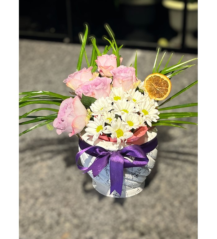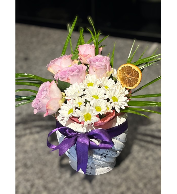 Mor güllerin zarafeti ve papatyaların masumiyetiyle hazırlanmış bu eşsiz aranjman, sevdiklerinize şıklık ve samimiyet dolu bir mesaj iletmenin harika bir yoludur. İster özel bir kutlama, ister günlük bir jest için bu aranjman, duygularınızı en güzel şekilde ifade eder.