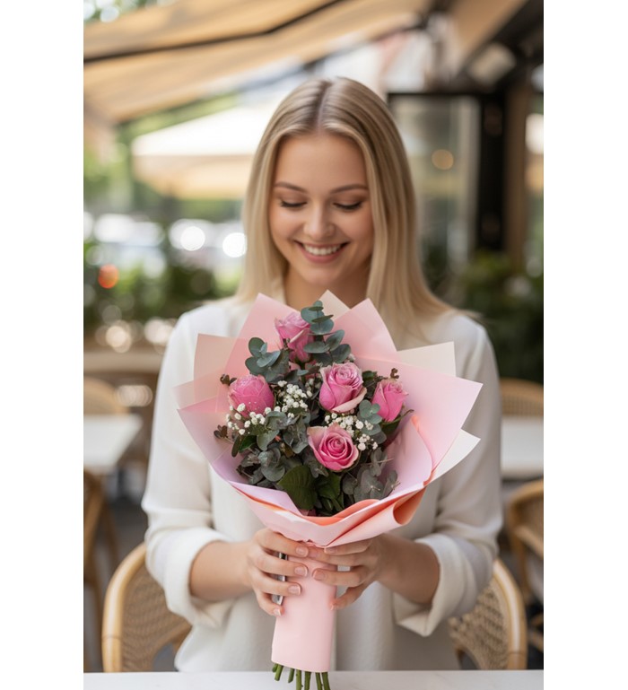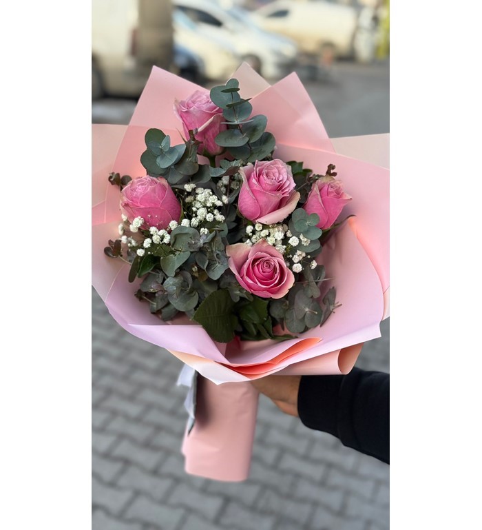 Zarif pembe güllerin uyumlu pembe paketle buluştuğu bu 5’li gül buketi, sevgi ve nezaketi en sade haliyle yansıtır. Şık sunumu ve yumuşak tonlarıyla romantik anlara anlam katan, özenle hazırlanmış bir bukettir.