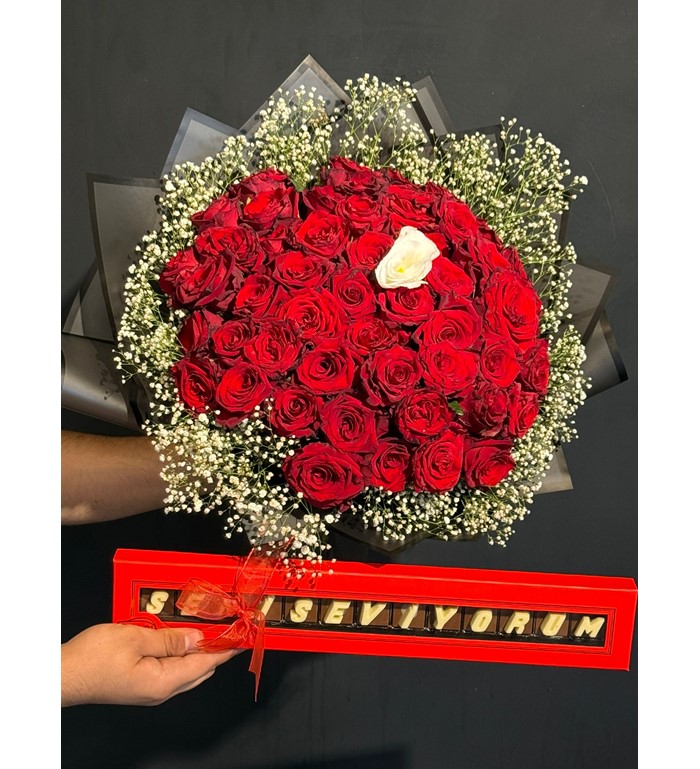 Aşkın en tutkulu ifadesiyle karşınızda: 50 kırmızı gül ve aralarındaki beyaz gülün zarafetiyle süslenmiş bu özel buket, yanında sevginizi tatlandıracak "Seni Seviyorum" yazılı özel çikolata ile birleşiyor. Romantik jestlerin en özel hali, sevgilinize unutulmaz bir sürpriz yapmak isteyenler için ideal.