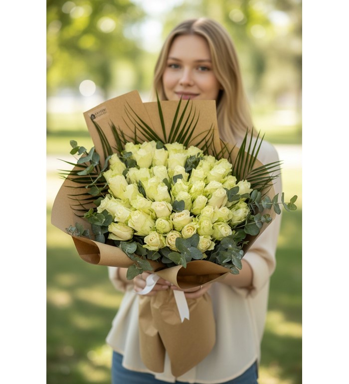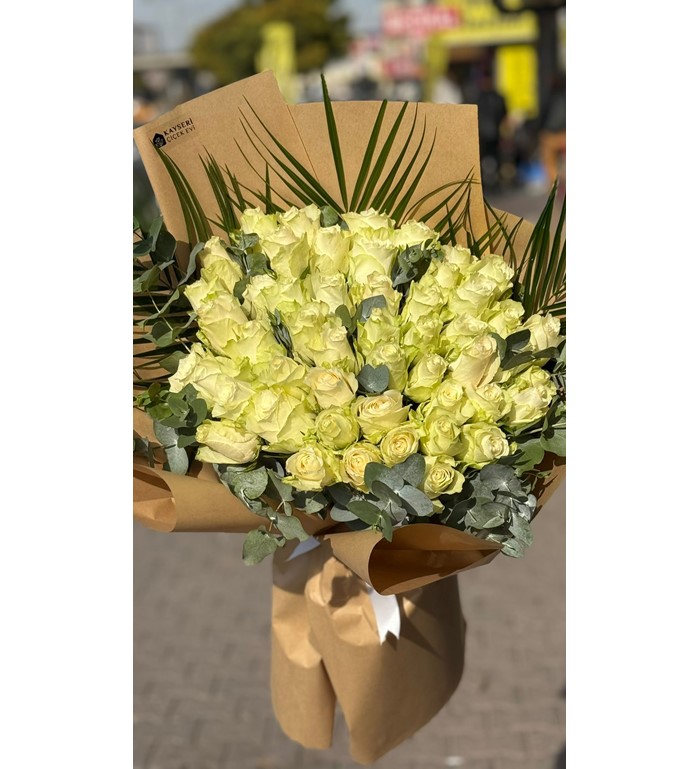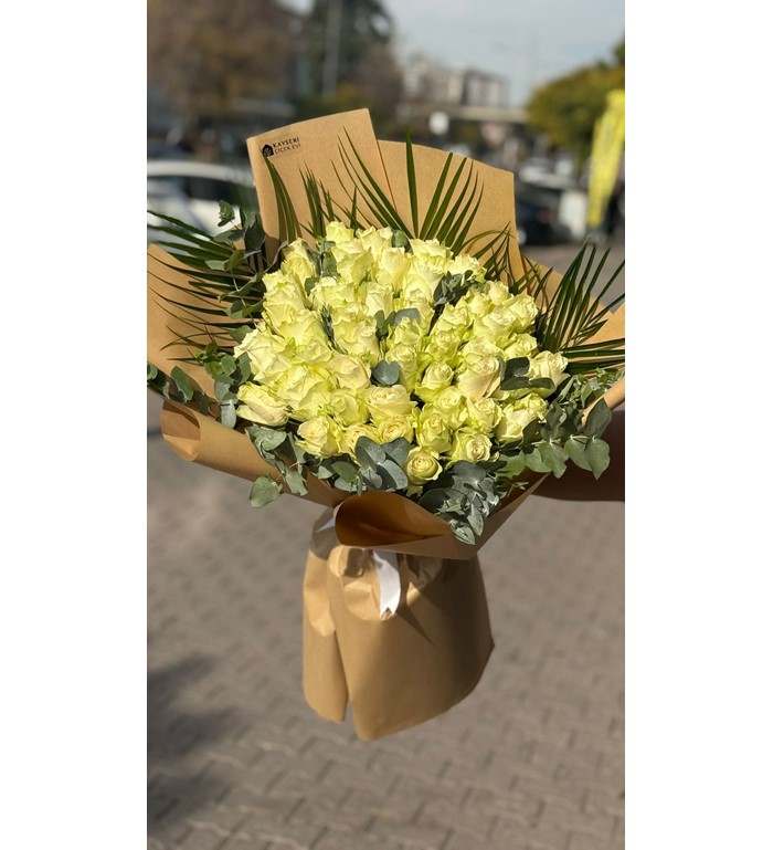 Saflığın ve zarafetin en sade hâlini taşıyan 51 adet beyaz gül, doğal kraft kağıt ile özenle paketlenerek şık ve modern bir sunuma dönüştürülür. Minimal ama etkileyici tasarımıyla doğum günü, yıldönümü, söz–nişan veya özel kutlamalar için kusursuz bir hediye seçeneğidir. Beyaz güllerin masumiyet dolu görünümü, doğal kağıt ambalajın sıcak dokusuyla birleşerek her zevke hitap eden estetik bir buket oluşturur.