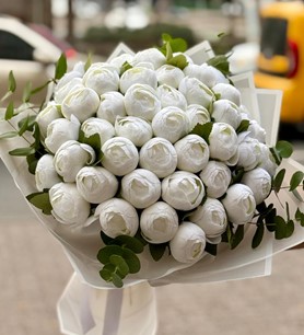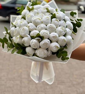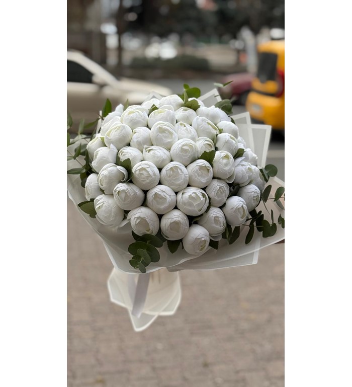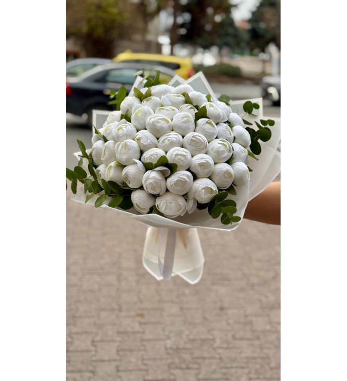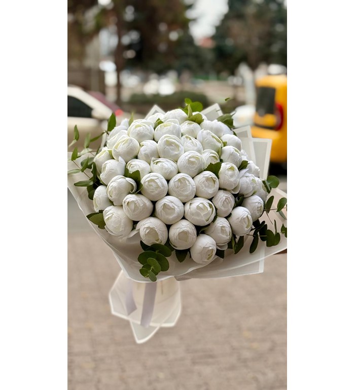 51 adet beyaz yapay şakayık çiçeğinden özenle hazırlanan bu buket, sade ve zarif tasarımıyla dikkat çeker. Gerçeğe yakın dokusu ve doğal beyaz tonları sayesinde bulunduğu ortama ferahlık ve şıklık katar. Uzun ömürlü yapay çiçeklerden oluştuğu için ev, ofis, organizasyon ve özel gün dekorasyonlarında güvenle tercih edilebilir.