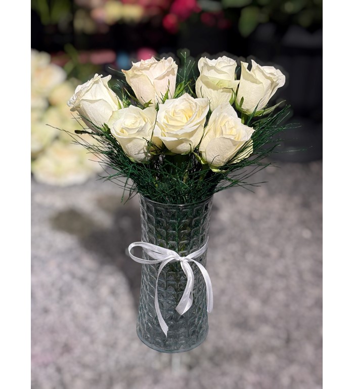 Saflık ve zarafetin simgesi olan beyaz güller, bu özel tasarımda 7 adet olarak şık bir vazoda bir araya geliyor. Beyaz güller; masumiyet, yeni başlangıçlar ve içten sevgi anlamlarını taşır. Sayısı itibarıyla "tam ve kusursuz bir sevgi"yi ifade eden 7 beyaz gül, duygularınızı sade ve etkileyici bir şekilde anlatmanın en zarif yoludur.