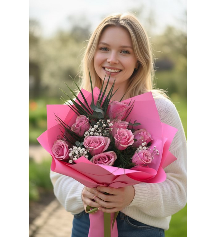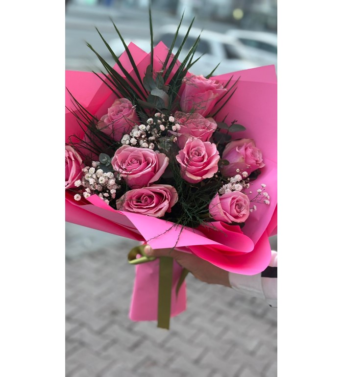 9 adet ithal pembe gül, zarif ve romantik bir buket tasarımıyla özenle hazırlanır. Pembe güllerin yumuşak tonları, şık ambalaj detaylarıyla tamamlanarak özel anlara anlam katar.