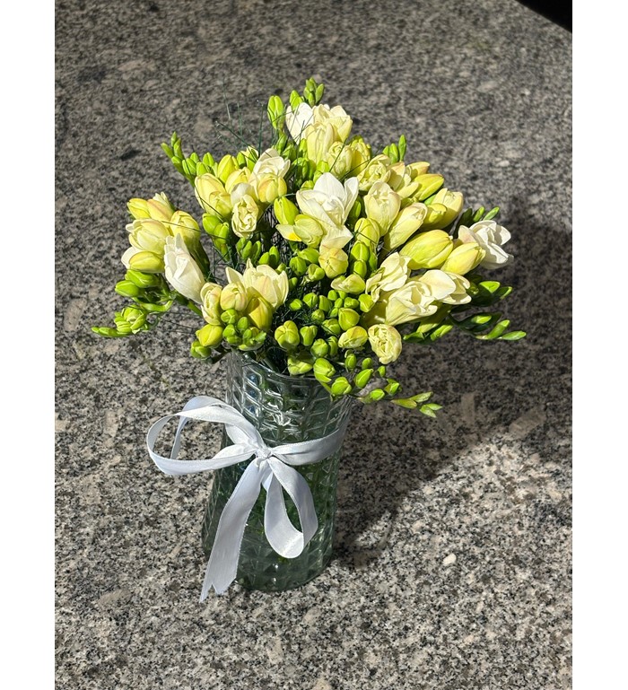 Bazı çiçekler sadece görünüşleriyle değil, ruhunuza dokunan kokularıyla hatırlanır. "Pure Aroma" serimiz, beyaz frezyanın o dünyaca ünlü, ferahlatıcı parfümünü cam vazonun şeffaf zarafetiyle birleştiriyor. Masumiyetin simgesi olan bembeyaz frezya dalları, hiçbir ekleme gerektirmeyen doğal güzelliğiyle sofralarınızın, ofis masalarınızın veya başucu komodinlerinizin en zarif eşlikçisi olacak.