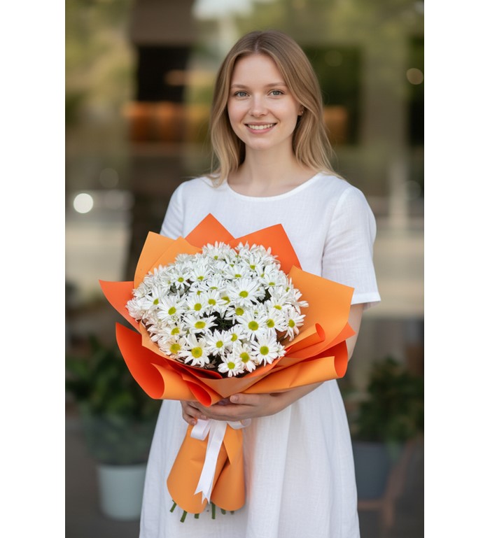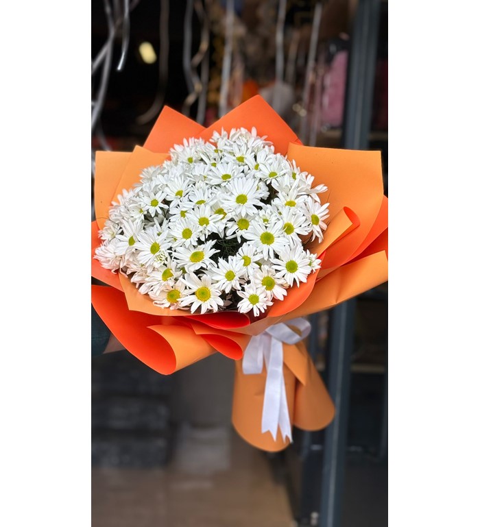 Masumiyetin, içtenliğin ve doğallığın simgesi olan papatyalar, bu özel bukette taptaze ve zarif bir şekilde bir araya geliyor. Bembeyaz papatyalarla hazırlanan bu şık aranjman, hem doğallığı sevenler hem de sevdiklerine içten bir mutluluk hediye etmek isteyenler için ideal bir seçimdir.