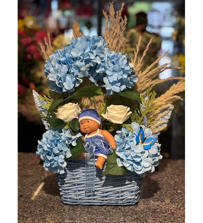 Hayatınıza yeni katılan minik bir mucize için kalıcı ve şık bir hediye arıyorsanız, Erkek Bebek Yapay Çiçek (9) tam size göre! Mavi ve beyaz tonlarının ağırlıkta olduğu bu özel aranjman; kaliteli yapay çiçeklerle, sevimli bebek figürleri ve özenle seçilmiş dekoratif detaylarla buluşuyor.