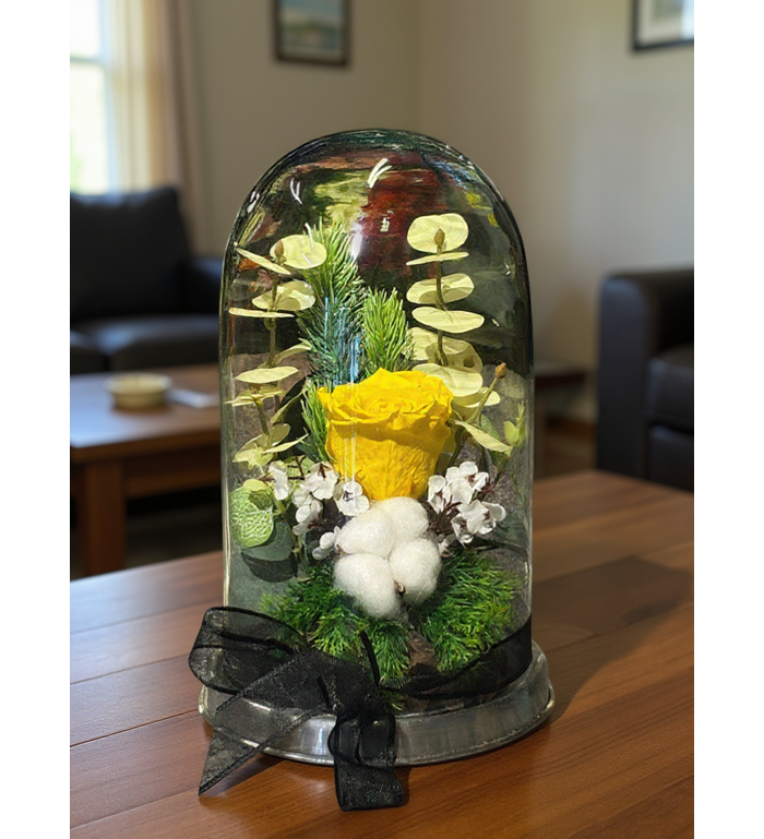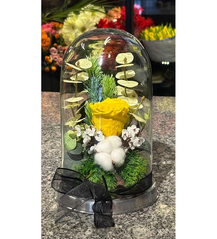 Önemli Not: Ürünlerimizde kullanılan sarı solmayan güllerin kafa büyüklükleri ve fanus içerisindeki yardımcı dekoratif materyaller (doğal yosun, kuru bitkiler), stok durumuna ve ürünlerin doğal yapılarına bağlı olarak küçük farklılıklar gösterebilir. Ancak her zaman sarı solmayan gülün kalitesine ve fanus konseptine sadık kalınarak, en şık şekilde el işçiliğiyle hazırlanmaktadır.