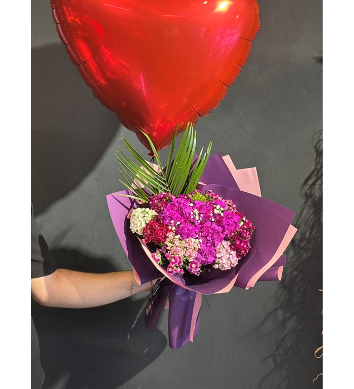 Aşkınızı anlatmanın en renkli hali! Zarif Hüsnü Yusuf çiçeklerinin romantik görünümü, kırmızı kalp folyo balonla buluşarak unutulmaz bir bukete dönüşüyor. Sevgilinize, eşinize ya da özel birine duygularınızı ifade etmek için ideal bir hediye.