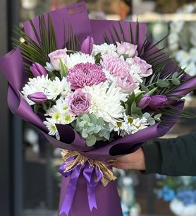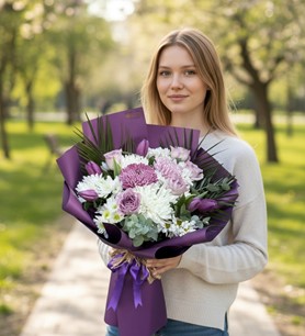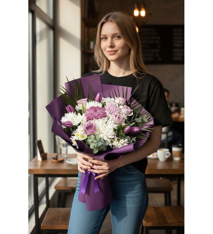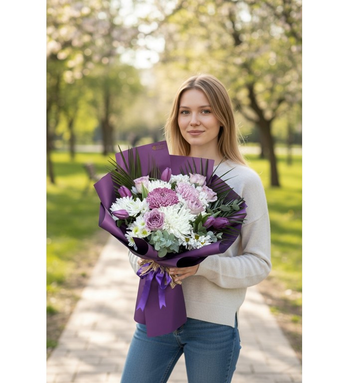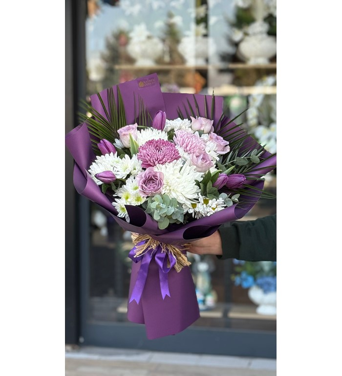 Lila güllerin romantizmi, mor lalelerin asaleti, anastasyaların gösterişi ve papatyaların doğal sadeliğiyle hazırlanır. Her detayıyla zarafet ve duygusallığı bir araya getiren bu özel buket, doğum günleri, yıldönümleri veya teşekkür hediyesi olarak mükemmel bir tercihtir.