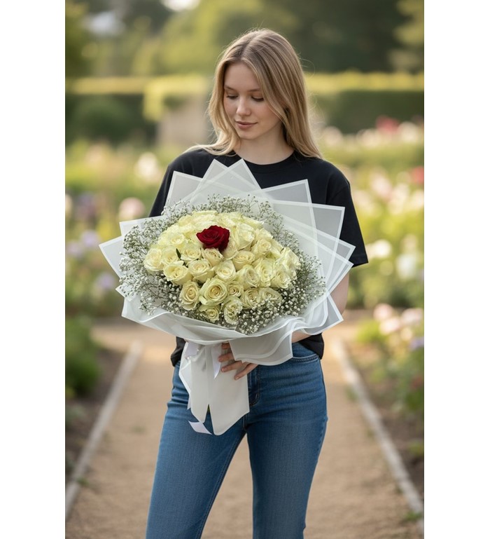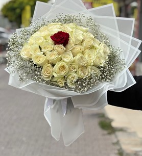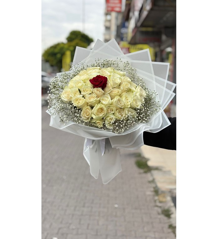 Saf sevginin simgesi beyaz güller ve aşkın en tutkulu hali olan kırmızı gül, bu özel bukette bir araya geliyor. İthal 50 Beyaz 1 Kırmızı Gül Buketi, zarafeti ve anlamı ile sevdiklerinize duygusal bir hediye sunmanın en etkileyici yollarından biridir. Özellikle sevgililer günü, evlilik yıl dönümü ya da özel bir kutlama için ideal bir tercihtir.