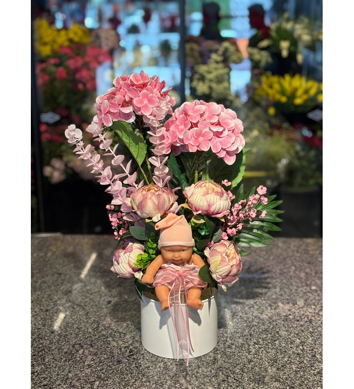 Solmayan ve formunu yıllarca koruyan yapay çiçekler sayesinde bu aranjman, ilk karşılaşmanın tatlı hatırasını uzun süre yaşatır. Doğum sonrası hastane ziyareti, baby shower ya da bebek mevlitlerinde tercih edilebilecek anlamlı ve estetik bir hediyedir.