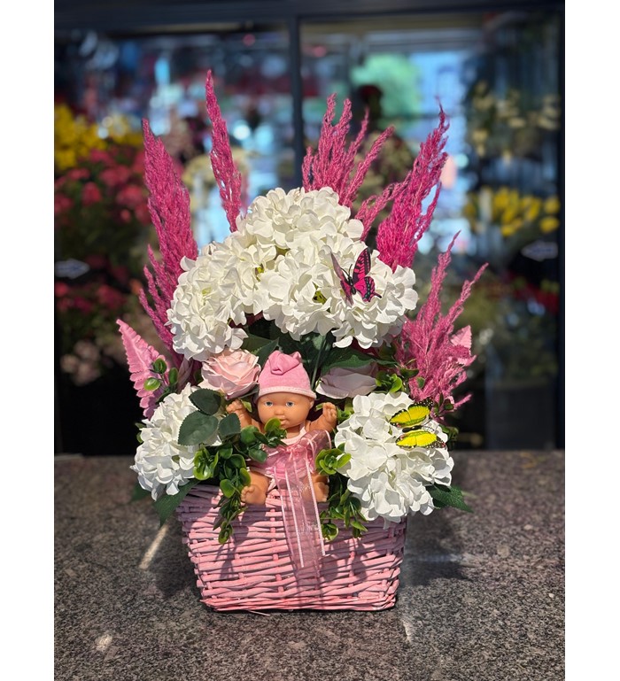 Yeni doğan kız bebeklere özel hazırlanan Kız Bebek Yapay Çiçek (9), zarif tasarımı ve uzun ömürlü yapısıyla unutulmaz bir hatıra sunuyor. Pembe ve pastel tonlarında seçilmiş yüksek kaliteli yapay çiçekler, sevimli bebek temalı süslemelerle bir araya getirilerek estetik bir aranjman haline getirildi.