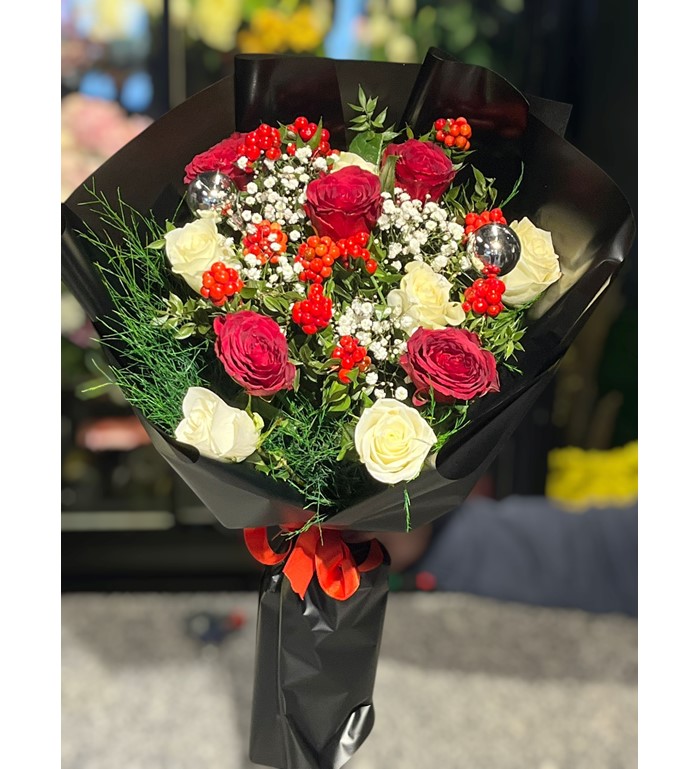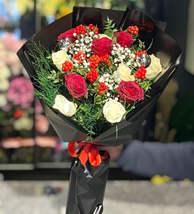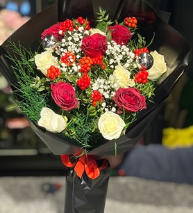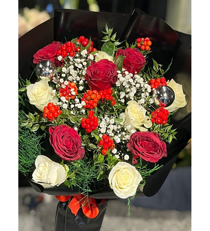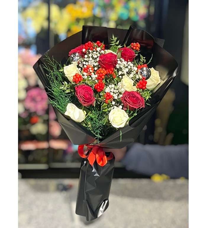 Kokina’nın çarpıcı kırmızı tonları ve güllerin zarafeti, buketi görsel bir şölen haline getirir. Yılbaşı, özel günler ya da sevdiklerinize içten bir teşekkür etmek için bu anlamlı tasarımı tercih edebilirsiniz.