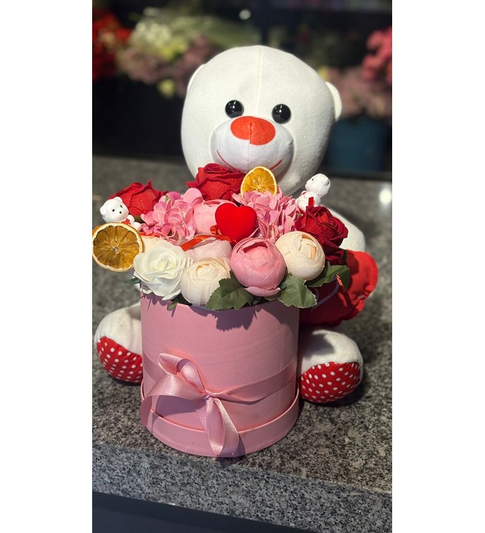 Gerçeğinden ayırt edilmesi zor yapay şakayık güller, şıklığı tamamlayan dekoratif kutu ve sevimli peluş ayıcık ile bu aranjman; aşkı, mutluluğu ve kalıcı bir hatırayı aynı anda sunar. Solmayan yapısıyla uzun yıllar ilk günkü şıklığını korur, hediye ettiğiniz anı daima canlı tutar.