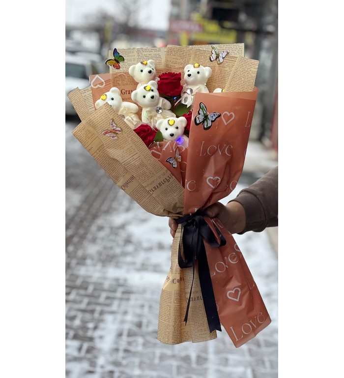 Canlı turuncu güller ile ışıl ışıl LED’li sevimli bir ayıcığın buluştuğu bu özel buket paketi, duygularınızı sıcak ve enerjik bir şekilde ifade eder. Turuncunun enerjisi ile hediye ettiğiniz kişi için unutulmaz bir sürpriz yaratır.