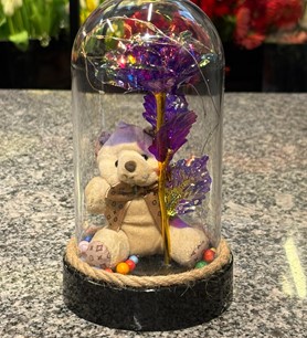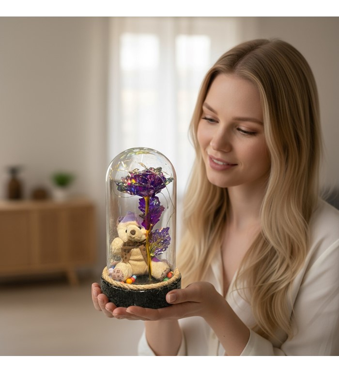 Ledli Ayıcıklı Mor Sonsuzluk Gülü, estetik görünümüyle romantik anları unutulmaz kılmak isteyenler için tasarlandı. Mor tonlarındaki solmayan yapay gül, şeffaf cam fanus içinde ışıl ışıl LED detaylarıyla büyüleyici bir atmosfer oluşturur. Yanındaki sevimli ayıcık figürü ise bu özel aranjmana sıcak ve anlamlı bir dokunuş katar.