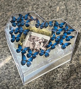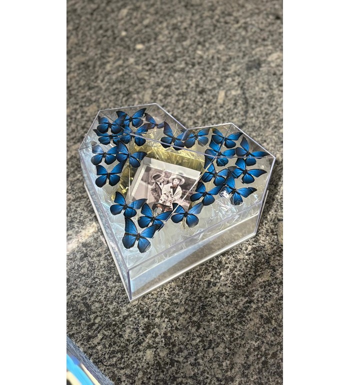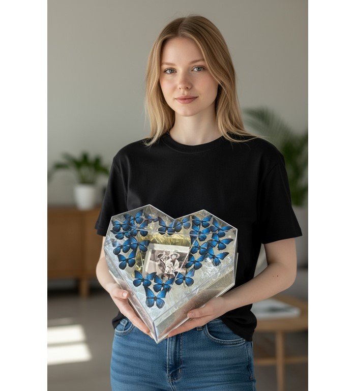 Ledli yapay mavi kelebek çerçeveli kalp aranjmanı, kalp formu, mavi yapay güller ve kelebek detaylarıyla romantik ve dekoratif bir hediye sunar.