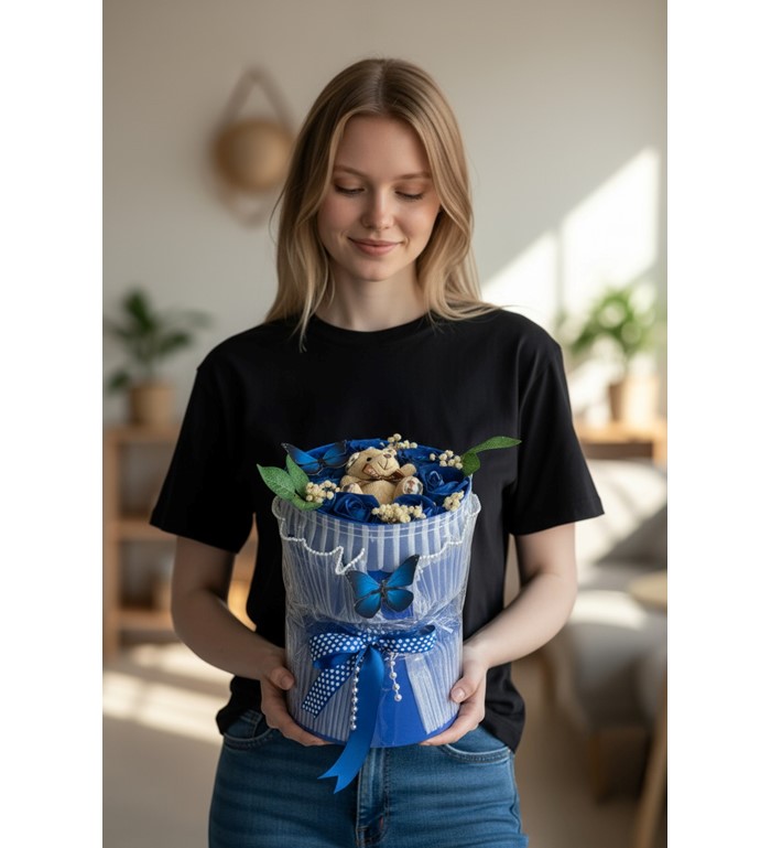 Silindir kutu içerisinde yer alan tüller ve yapay mavi güller, led ışık detaylarıyla birleşerek bulunduğu ortama sıcak ve romantik bir atmosfer kazandırır.