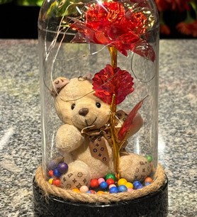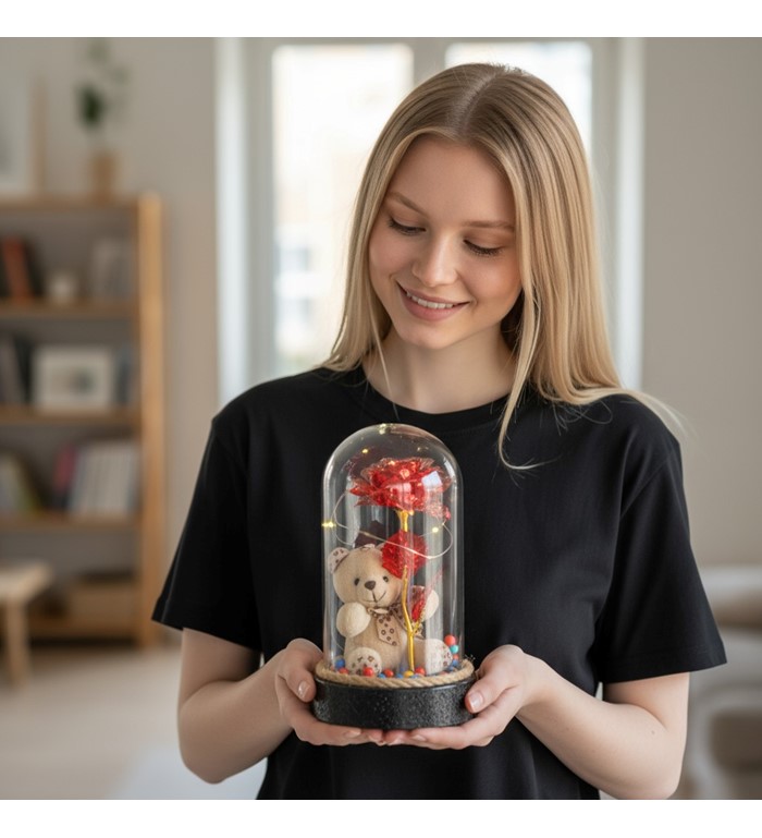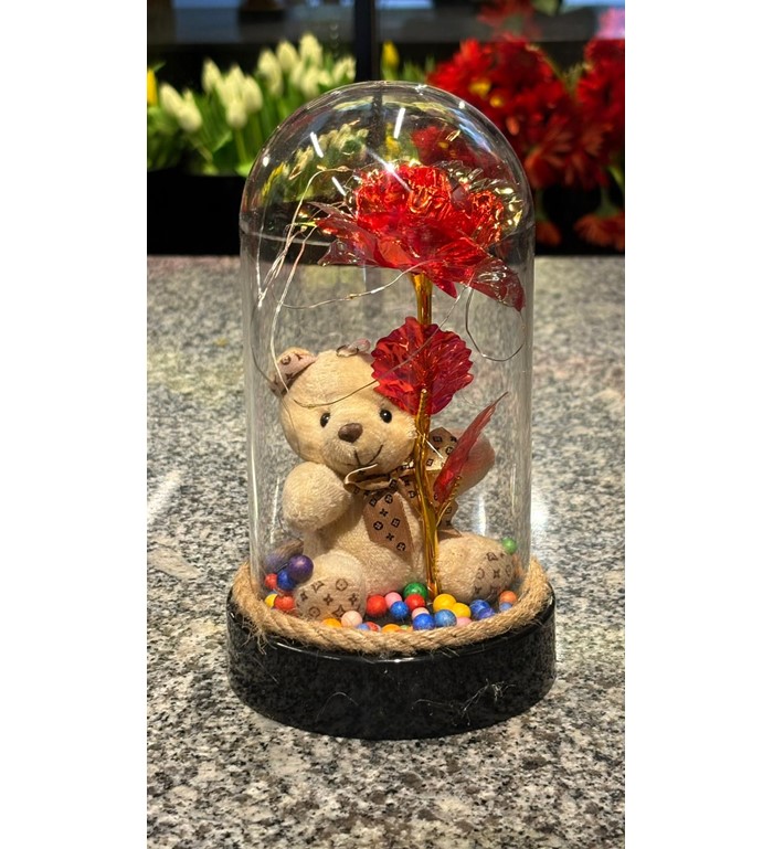 Ledli Ayıcıklı Kırmızı Sonsuzluk Gülü, aşkın ve tutkunun sembolü olan kırmızı gülün büyüsünü modern bir tasarımla buluşturuyor. Cam fanus içerisinde yer alan kırmızı yapay gül, LED ışıklarla çevrelenerek ışıltılı bir atmosfer oluşturur. Yanındaki sevimli ayıcık figürü, bu özel aranjmana sıcaklık ve duygusal bir anlam katar.
