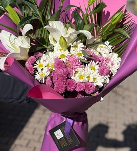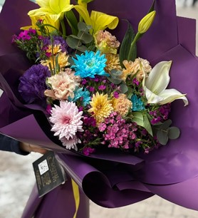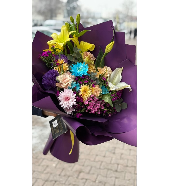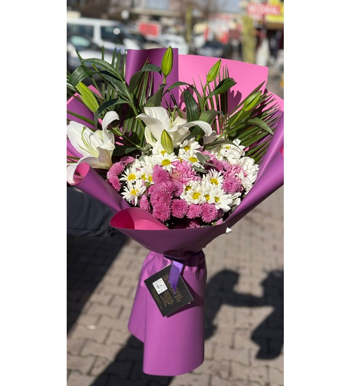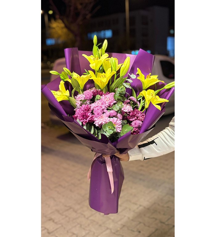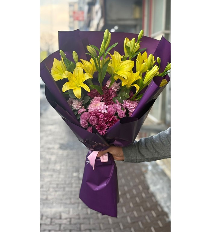 Bu büyük boy buket; lilyum, papatya ve hüsnü yusuf çiçekleri kullanılarak hazırlanır. Renkli çiçeklerin uyumu, mor renkli özel paket ile tamamlanarak canlı, ferah ve gösterişli bir görünüm sunar. Özel günler ve büyük sürprizler için ideal ölçüdedir.