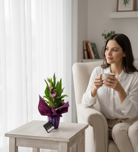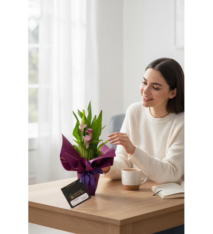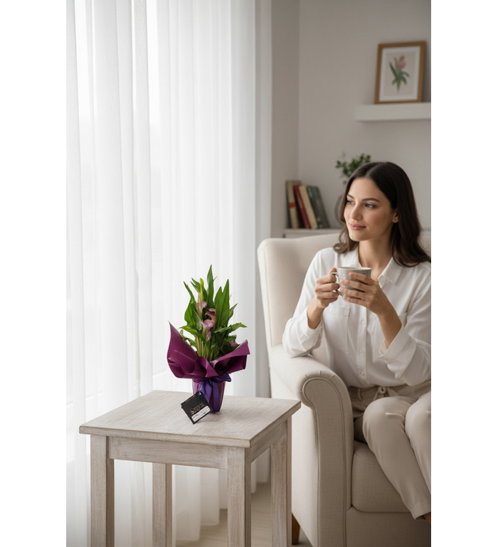 Zarif duruşu ve canlı mor rengiyle Mor Gala Saksı Çiçeği, ev ve ofis dekorasyonuna şıklık katar. Özenle seçilmiş sağlıklı bitkiler, özel saksısında hazırlanarak hem estetik hem de uzun ömürlü bir hediye alternatifi sunar.