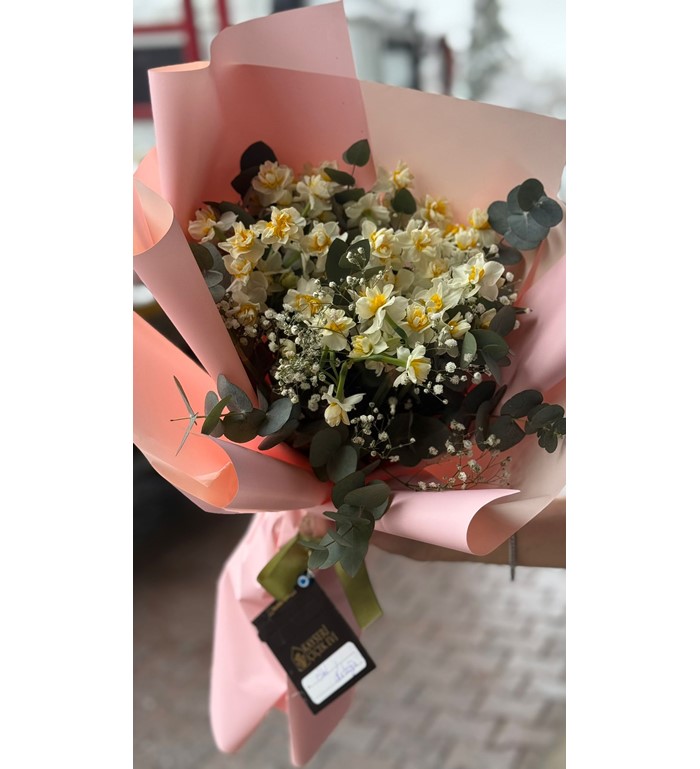 Bu standart boy buket; 25 dal nergis kullanılarak hazırlanır. Beyaz ve sarı tonlarının uyumlu kombinasyonu, pembe renkli özel paket ile tamamlanarak ferah, canlı ve zarif bir görünüm sunar. Günlük hediyeler ve özel anlar için ideal ölçüdedir.