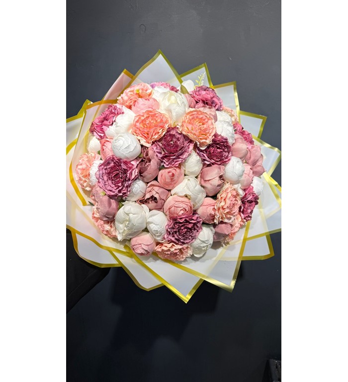 Zarafetin en görkemli haliyle tanışın! "Peony Infinity", tam 50 dal birinci sınıf yapay şakayığın bir araya gelmesiyle oluşan, hacmiyle göz kamaştıran devasa bir tasarımdır. Gerçek şakayıkların o çok katmanlı, büyüleyici yaprak yapısını ve soft renk geçişlerini birebir yansıtan bu özel aranjman, taze çiçeklerin güzelliğini zamanın ötesine taşıyor.