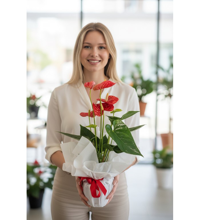 Önemli Not: Canlı bitkilerimiz doğası gereği form ve çiçek sayısı bakımından küçük farklılıklar gösterebilir. Ancak her zaman 45-50 cm boy standardına, sağlıklı kök yapısına ve türünün en canlı formuna sahip Antoryumlar arasından seçilerek, şık bir şekilde paketlenip teslim edilmektedir. Stok durumuna göre saksı rengi veya dekoratif süslemeler tasarımın ruhuna uygun şekilde değişebilir.