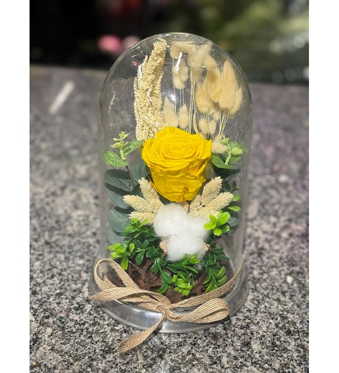 Neşe, dostluk ve pozitif enerjinin ölümsüz hali: Sarı Solmayan Gül. Doğal sarı güllerin özel tekniklerle uzun ömürlü hale getirilmesiyle hazırlanan bu eşsiz tasarım, tazeliğini ve canlılığını yıllarca korur. Gülümseten, içten ve sıcacık bir hediye alternatifi arayanlar için mükemmel bir seçimdir.