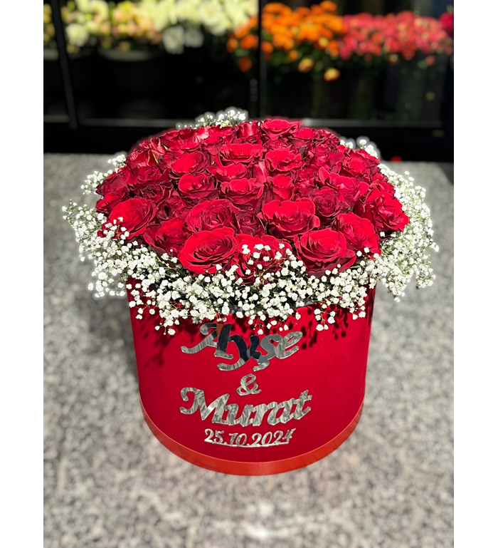 Bu özel tasarımlı silindir kutu, içinde 41 taze gül ile sunulur ve üzerine pleksi isimler eklenerek kişisel bir dokunuş kazandırılır. 41 gül, zarif bir şekilde düzenlenmiş olup, sevdiklerinize olan duygularınızı en güzel şekilde ifade eder. Pleksi isimler, bu özel hediyeyi daha da anlamlı kılarak, kişisel ve unutulmaz bir hediye sunar.