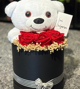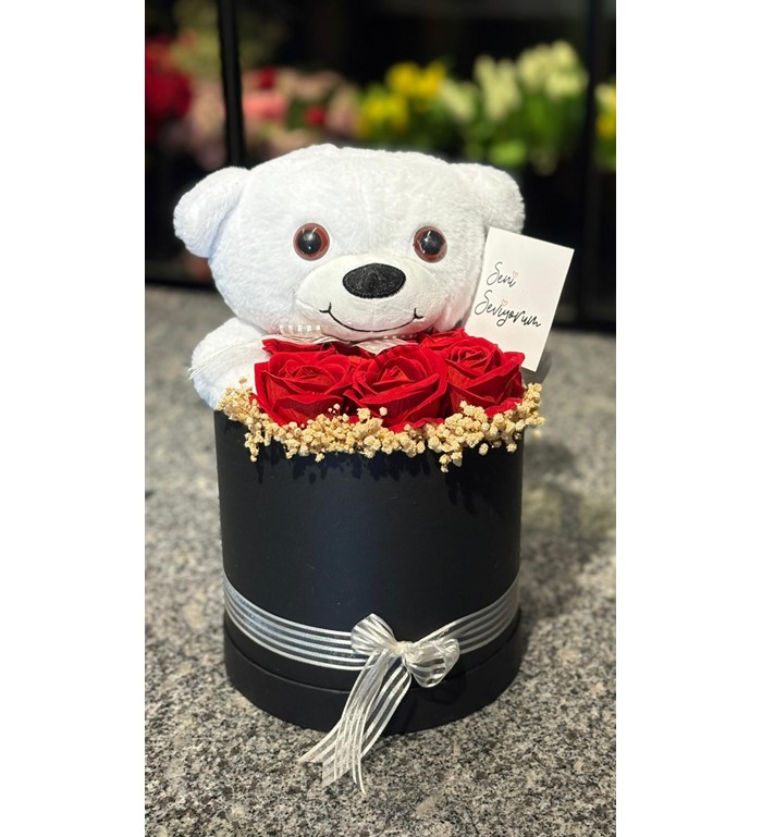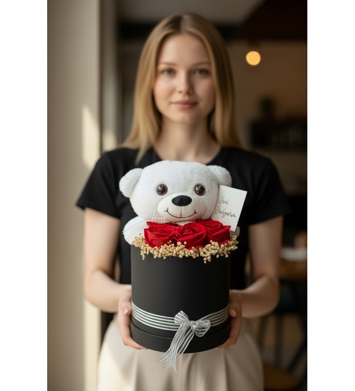 Silindir kutuda ayıcık ve yapay kırmızı güller aranjmanı, aşkı en zarif haliyle ifade etmenin kalıcı bir yoludur. 🧸🌹
