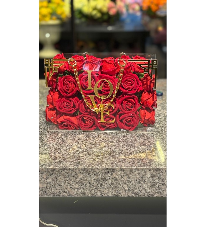 Bazı hediyeler sadece verilmez, bir hikaye anlatır. Sonsuz Aşk Çantası, modern tasarımı ve romantik detaylarıyla aşkınızı anlatmanın en şık yoludur. Kristal berraklığındaki pleksi çanta formu, altın rengi (gold) zincir detayı ve üzerindeki ikonik "LOVE" yazısıyla bu aranjman, klasik çiçek sunumlarını birer sanat eserine dönüştürüyor.