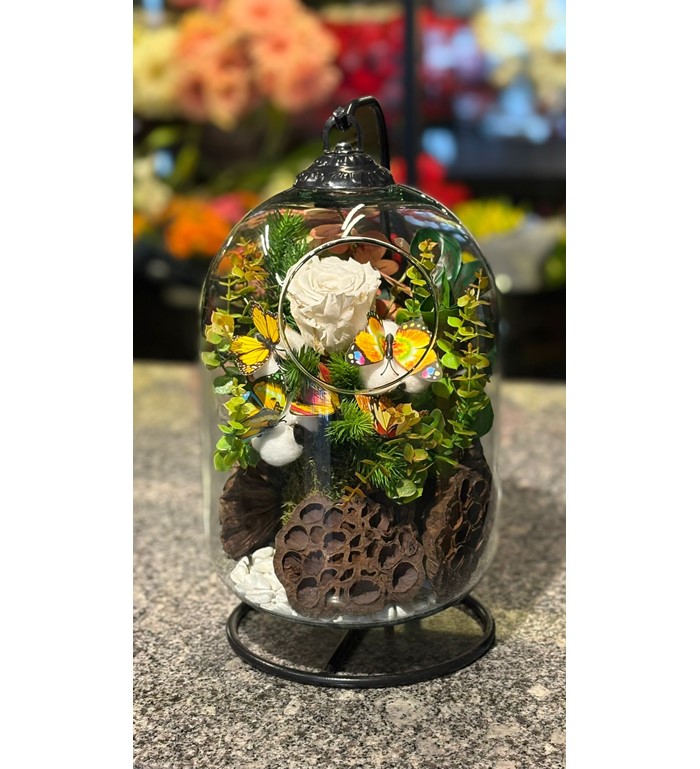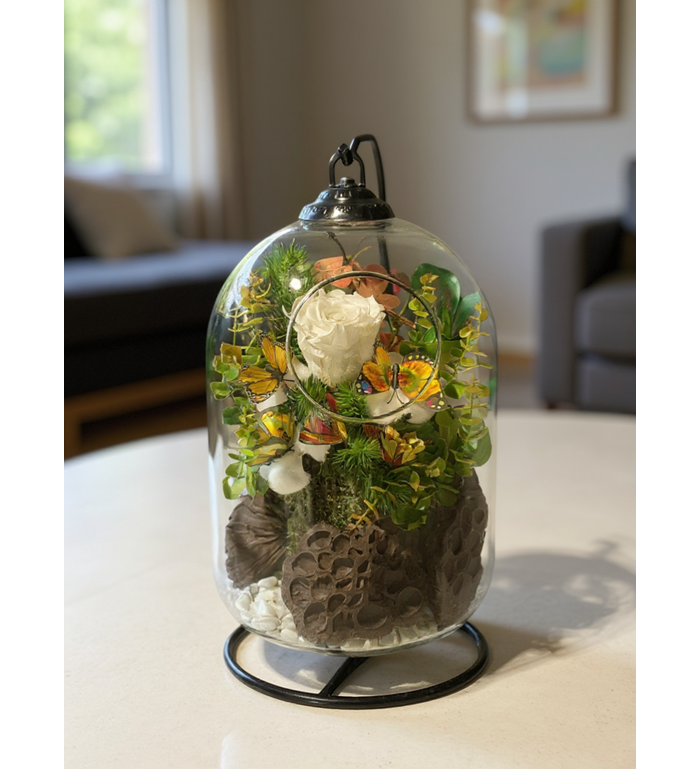 Zarif Detaylar: Fanus içindeki doğal yosunlar ve dekoratif detaylarla zenginleştirilmiş minimal bir dünya.