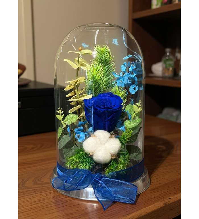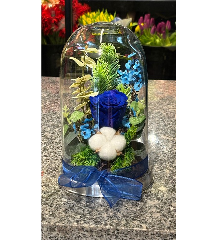 Önemli Not: Ürünlerimizde kullanılan mavi solmayan güllerin kafa büyüklükleri ve fanus içerisindeki yardımcı dekoratif materyaller (doğal yosun, kuru bitkiler), stok durumuna ve ürünlerin doğal yapılarına bağlı olarak küçük farklılıklar gösterebilir. Ancak her zaman mavi solmayan gülün kalitesine ve fanus konseptine sadık kalınarak, en şık şekilde el işçiliğiyle hazırlanmaktadır.